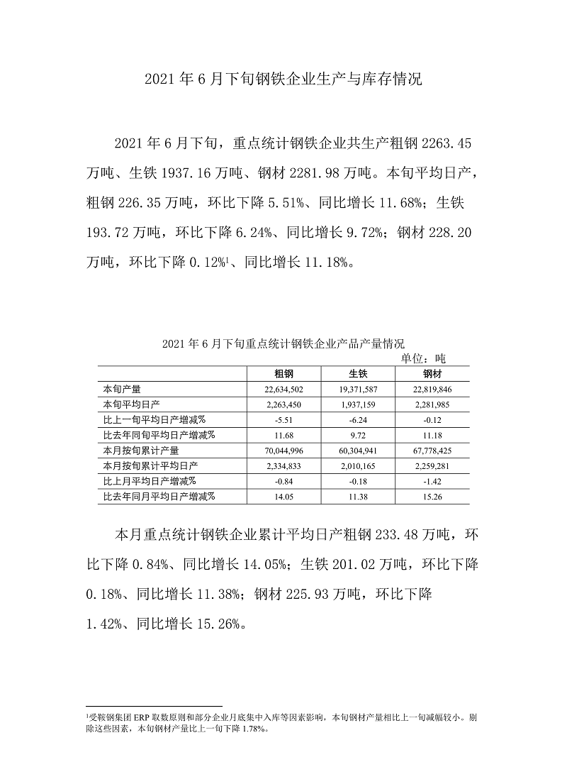 2021年6月下旬鋼鐵企業(yè)生產(chǎn)與庫(kù)存情況